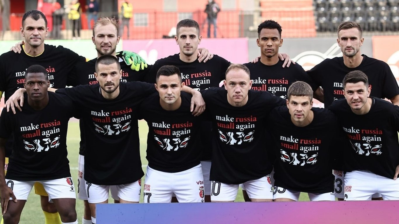 Рівненський "Верес" у матчі 11-го туру УПЛ підтримали флешмоб Президента України Володимира Зеленського. Раніше глава держави вийшов в ефір у чорній футболці з написом make russia small again — зробити Росію знову маленькою.