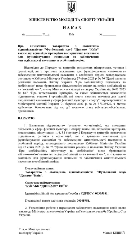 У наказі під підписом виконувача обов'язків міністра молоді та спорту Матвія Бідного "Динамо" отримало кваліфікацію критично важливого об'єкта для функціонування економіки та забезпечення життєдіяльності населення в особливий період.