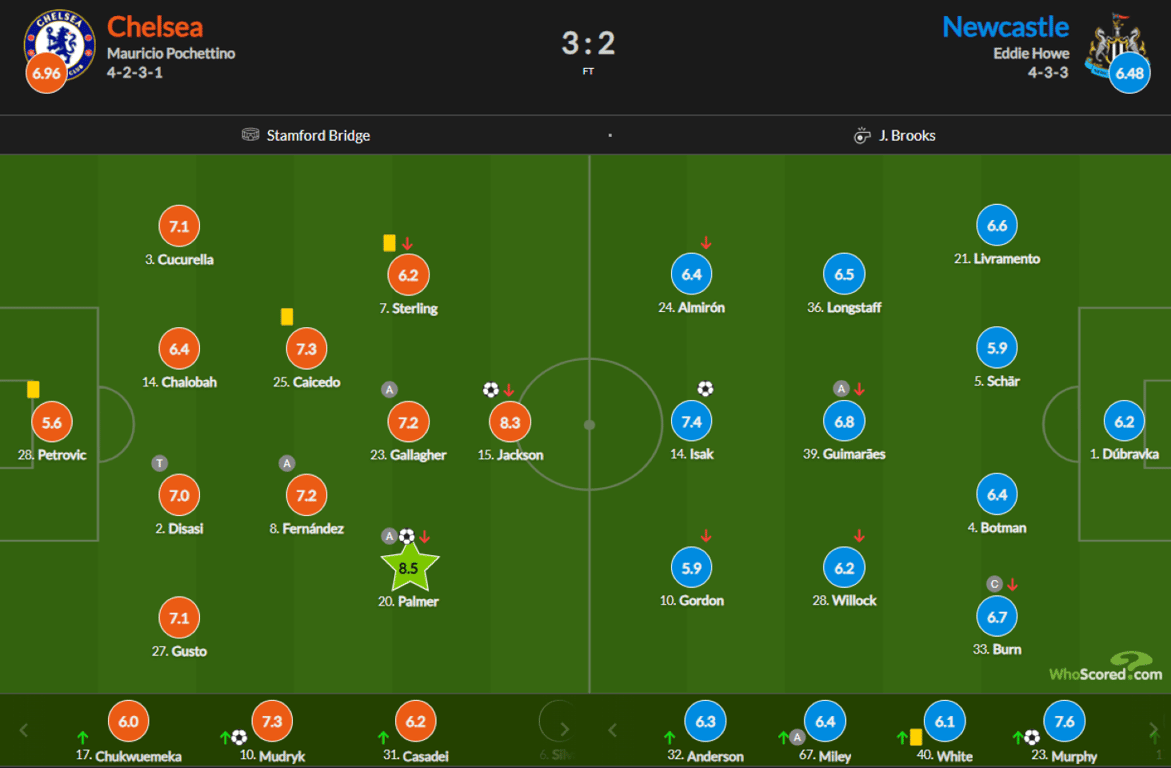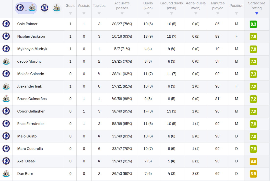 SofaScore оценил игру Мудрика на 7.8 баллов. Лучшим в матче стал Палмер — 8.2.