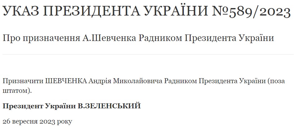 "Назначить Шевченко Андрея Николаевича Советником Президента Украины (вне штата)", — написано в тексте правительственного документа.