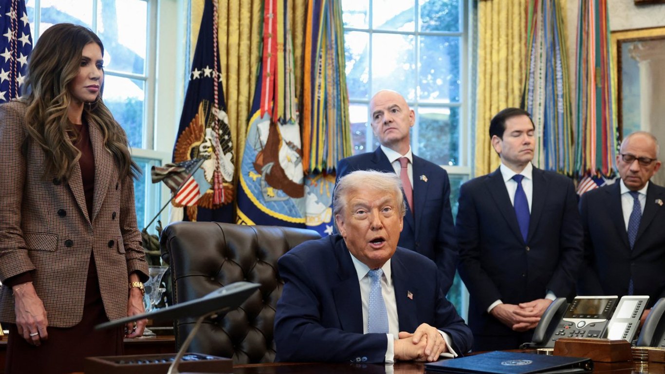 Дональд Трамп у Білому домі. На задньому фоні глава ФІФА Джанні Інфантіно. Фото: Reuters/Evelyn Hockstein